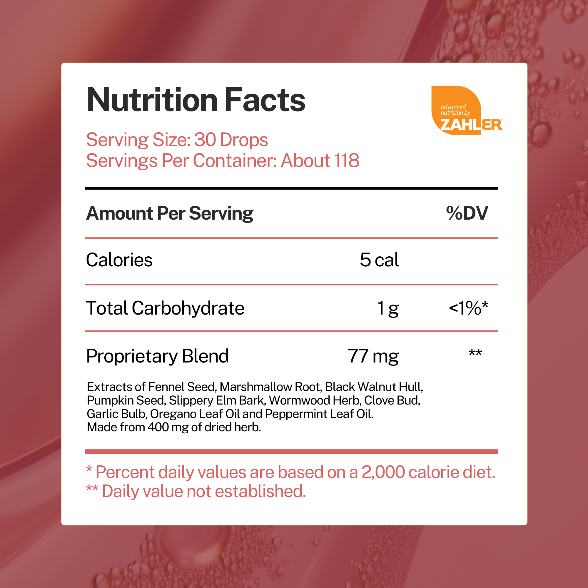 Proprietary Blend (77 mg): Extracts of Fennel Seed, Marshmallow Root, Black Walnut Hull, Pumpkin Seed, Slippery Elm Bark, Wormwood Herb, Clove Bud, Garlic Bulb, Oregano Leaf Oil, and Peppermint Leaf Oil. Other Ingredients: Vegetable Glycerin, Purified Water, Natural Flavor.